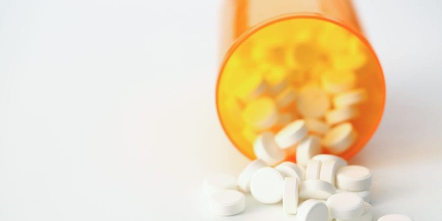 An orange bottle full of white pills spills out on a white table. A pile of the pills sits haphazardly in front of the open bottle.